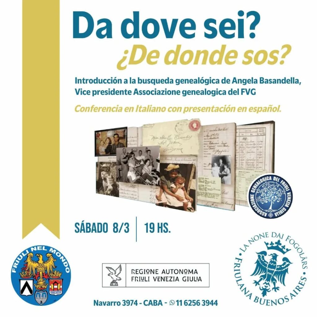 Conferencia sobre Genealogia libre y gratuita. Sábado 8 de marzo 2025 18 hs. En esta conferencia a cargo Angela Basandella, Vice Presidente de la Asociación Genealógica del Friuli Venezia Giulia, nos introducirá en las herramientas y sitios confiables disponibles Online para realizar nuestras búsquedas de los ancestros, donde en la actualidad se encuentra disponible toda la información digitalizada y ordenada para la búsqueda de las familias para armar nuestro árbol.