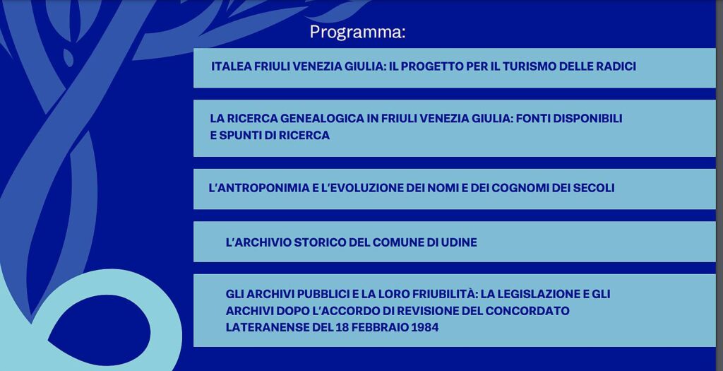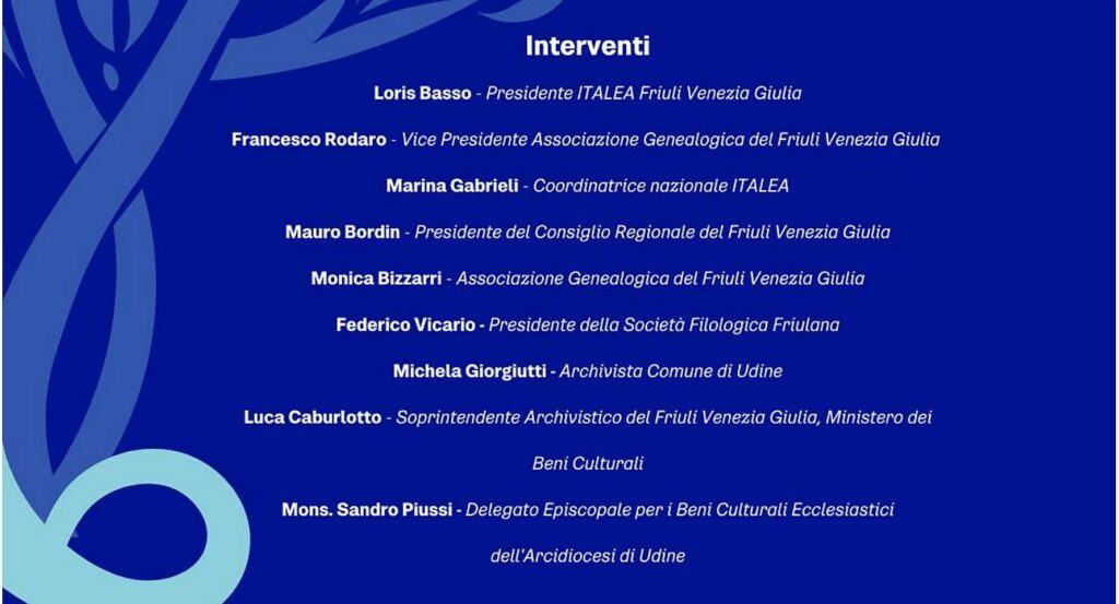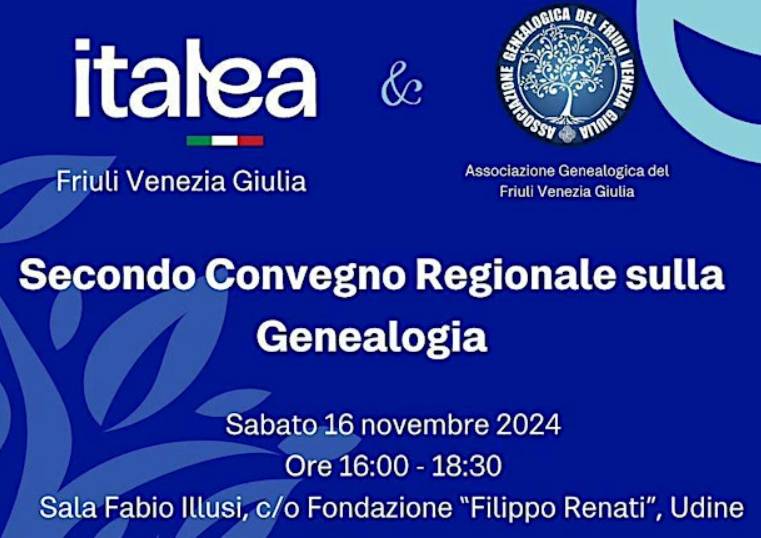 Abbiamo il piacere di comunicare a Soci e Amici che sabato 16 novembre 2024,dalle ore 16 alle ore 18.30, a Udine in Via San Valentino 23/25,Sala “Fabio Illusi” della Fondazione “Filippo Renati”, avrà luogo il Convegno Regionale 2024 sulla Genealogia Qui sotto il link per prenotare il tuo posto.L’ingresso è liberocon obbligo di prenotazione. Posti limitati. PRENOTA https://www.eventbrite.it/e/bigliettisecondo-convegno-regionalegenealogia-udine